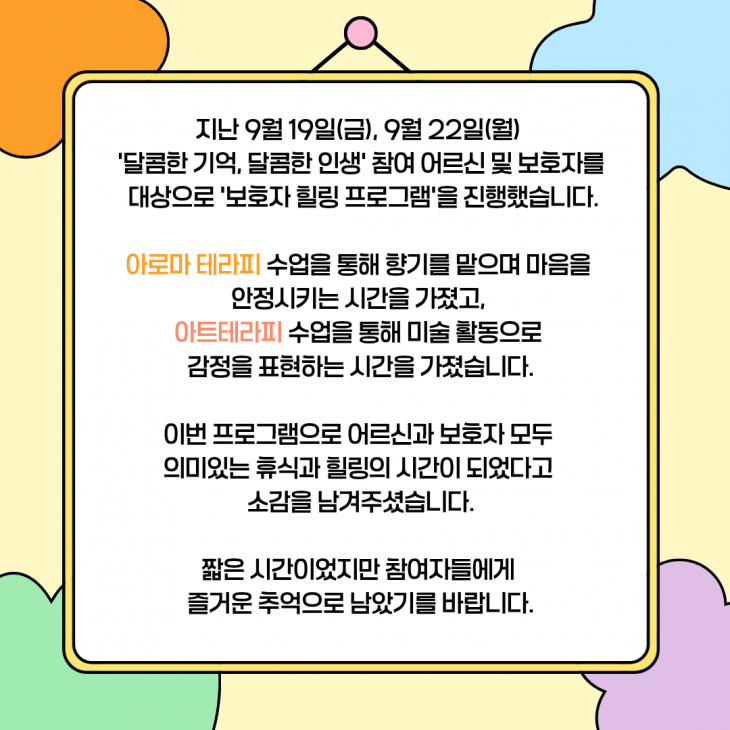 [프로그램팀 2025 달콤한 기억, 달콤한 인생 - 보호자 힐링 프로그램 페이지 정보 작성자 매화관리자 작성일 25-10-14 20:26 조회 85회 댓글 0건 본문 ★ 프로그램 문의 : 김수빈 사회복지사 / 070-4367-4205 이전글 다음글 목록