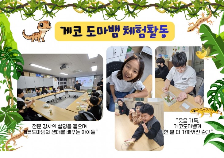 처음에는 파충류에 대한 낯섦으로 긴장하던 아이들도 귀여운 게코도마뱀을 직접 만나며 금세 호기심과 웃음을 보였습니다.