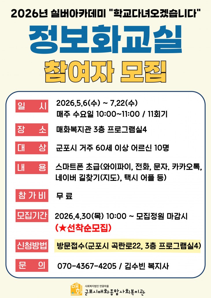 [프로그램팀] 2026년 실버아카데미 - 정보화교실(5~7월) 참여자 모집 페이지 정보 작성자 매화관리자 작성일 26-04-27 12:10 조회 20회 댓글 0건 본문 ☎문의 : 070-4367-4205 / 김수빈 복지사 다음글 목록