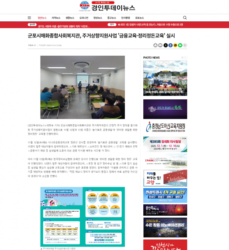 [경인투데이뉴스]군포시매화종합사회복지관, 주거상향지원사업 '금융교육,정리정돈교육' 실시