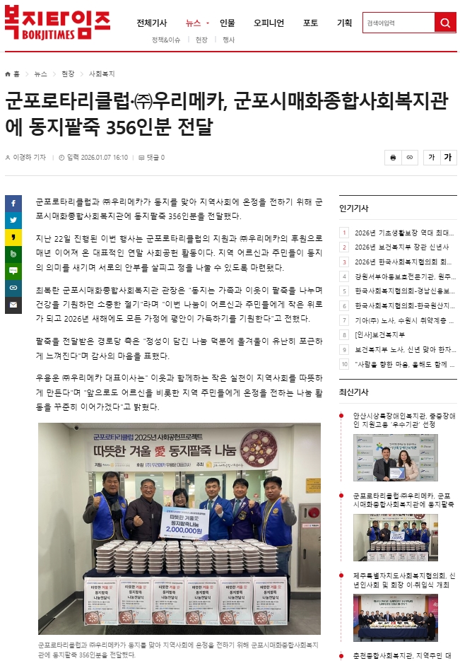 [복지타임즈] 군포로타리클럽·㈜우리메카, 군포시매화종합사회복지관에 동지팥죽 356인분 전달