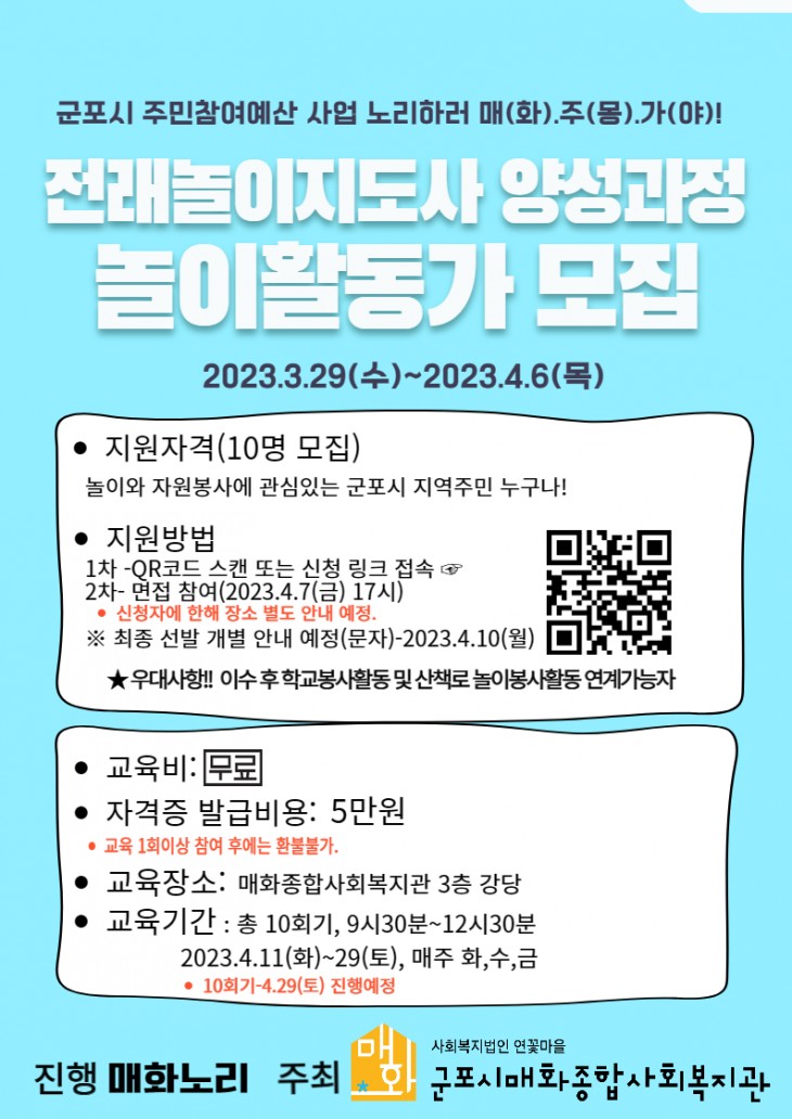 [참여자모집마감]2023년 전래놀이지도사 양성과정 놀이활동가 모집 페이지 정보 작성자 관리자 작성일 23-03-29 15:32 조회 7,526회 댓글 0건 본문 놀이활동가 양성과정 신청링크https://naver.me/xhnFhtmd ■ 문의: 지역조직팀 정미화 선임 사회복지사 031-393-3677 이전글 다음글 목록