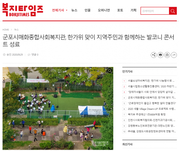 [복지타임즈]2020.09.29 군포시매화종합사회복지관, 한가위 맞이 지역주민과 함께하는 발코니 콘서트 성료
